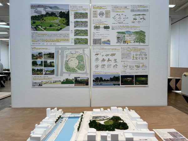 昨年と同様、川﨑研OB日建設計の八木弘毅先生のご指導の下、前期の景観デザイン論での設計課題を出展いたしました。コンセプトは「人と自然を結び付ける2つの循環」で、都市と東山の中間領域で多くの人が利用する三条広場に、森をつくり自然保全プログラムを組み込むことで、持続的な都市と自然の関係の新たな在り方を提示する「ショーケース」としての広場を提案しました。