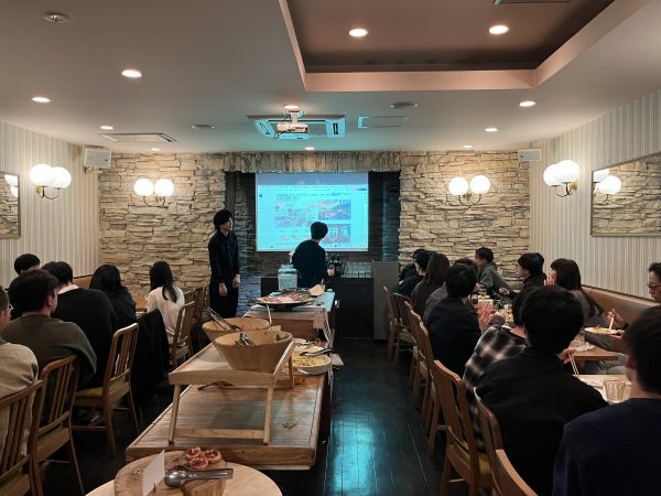 今年はikariya523さんにお世話になり、ビュッフェ形式での開催となりました。各々が席に好きなものを持ち帰って、会話に花を咲かせます。久しぶりの再会を喜ぶ先輩方、今年一年を振り返る学生。